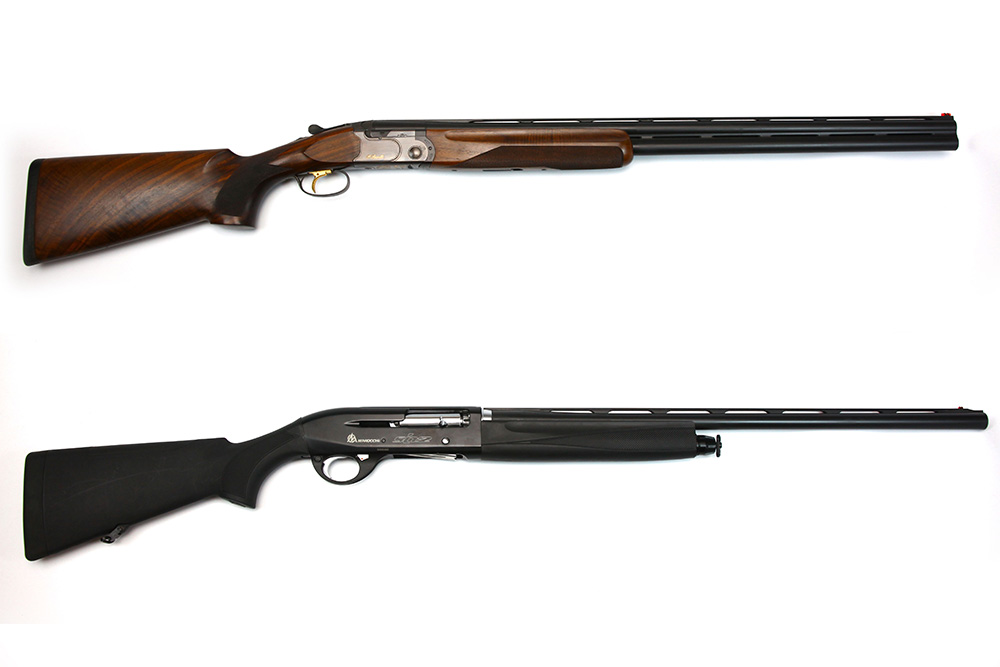 散弾銃(上下二連式[上]と自動式[下])。もっとも一般的な狩猟用の銃で、第一種銃猟免許が必要です。銃の中ではもっとも万能で、使用する弾を変えることで鳥猟から大物猟まで使えます。