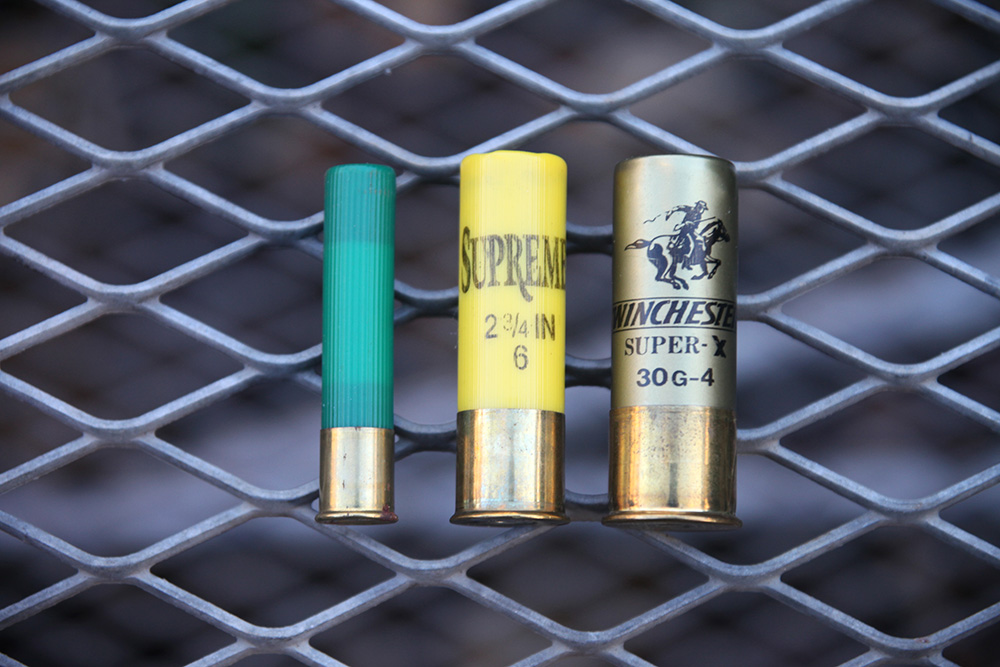 左から410番、20番、12番の散弾実包。現在は12番がもっとも一般的ですが、反動の少ない20番を使うハンターも少なくありません。