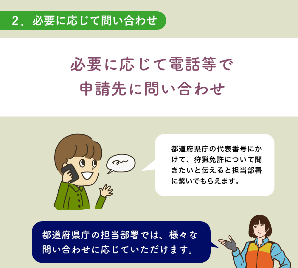 なお、網猟とわな猟を行うのには、狩猟免許の取得のみで足りますが、銃猟を行う場合は、都道府県公安委員会から、「銃刀法」に基づく猟銃の「銃砲所持許可」(猟銃1本ごと)の取得も必要です。