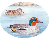 メスは地味な色調のため、識別がやや難しい。小型のカモ類としては、他に非狩猟鳥のトモエガモがいる。